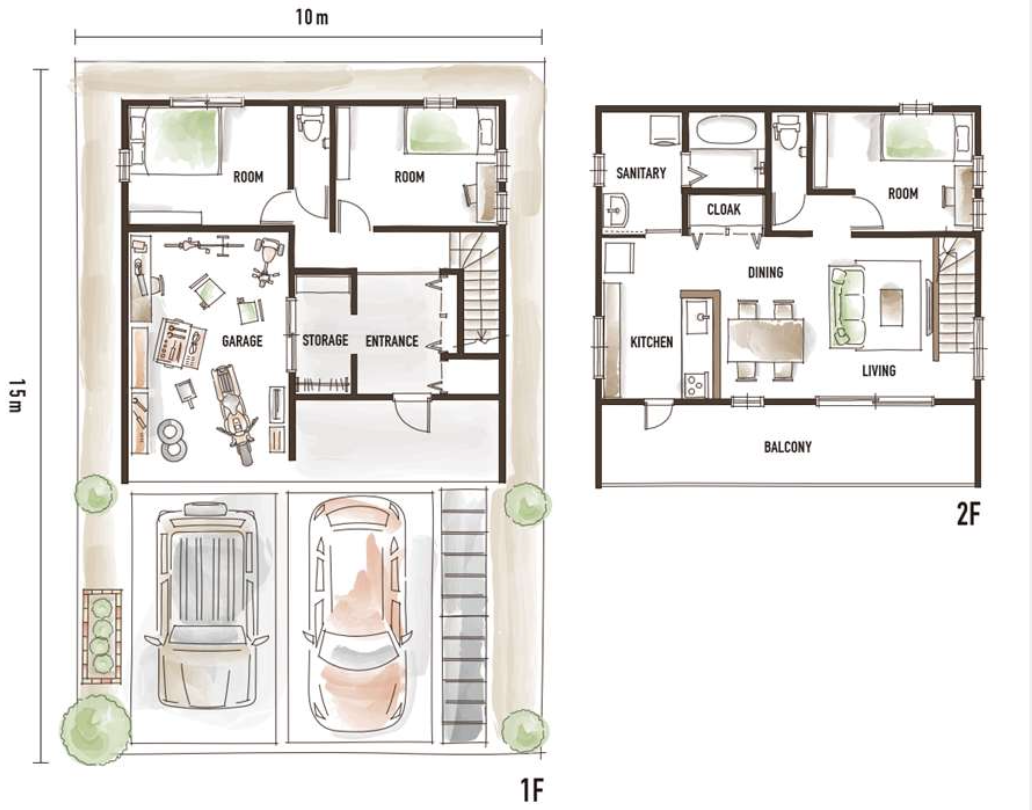 車2台を駐車できる、広々ガレージプラン。郊外の景色を取り込む、間口にゆとりを持たせたワイドな設計がポイント。